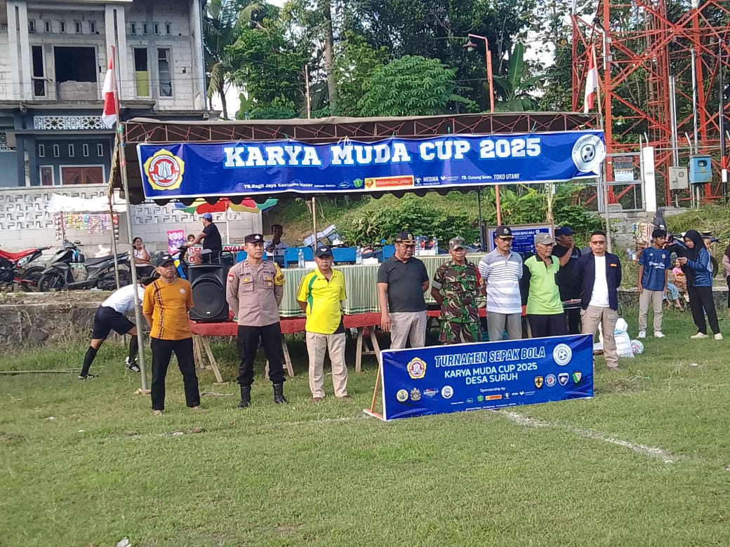 Kegiatan pembukaan turnamen sepak bola Desa Suruh yang dihadiri perangkat kecamatan dan pemerintah desa sebagai bentuk dukungan terhadap pengembangan olahraga masyarakat.