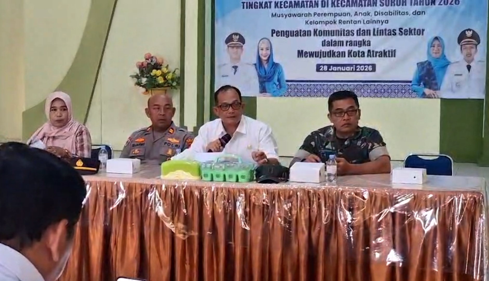 Trenggalek, 28 Januari 2026 - Pemerintah Kecamatan Suruh melaksanakan Musyawarah Perempuan, Anak, Disabilitas, dan Kelompok Rentan Lainnya (Musrena Keren) Tingkat Kecamatan pada hari Rabu, 28 Januari 2026, bertempat di Aula Kecamatan Suruh, Kecamatan Suruh. Kegiatan ini dimulai pada pukul 08.30 WIB sebagai bagian dari tahapan perencanaan pembangunan daerah yang menjadi forum strategis untuk membahas usulan pembangunan yang berperspektif inklusif di wilayah Kecamatan Suruh.